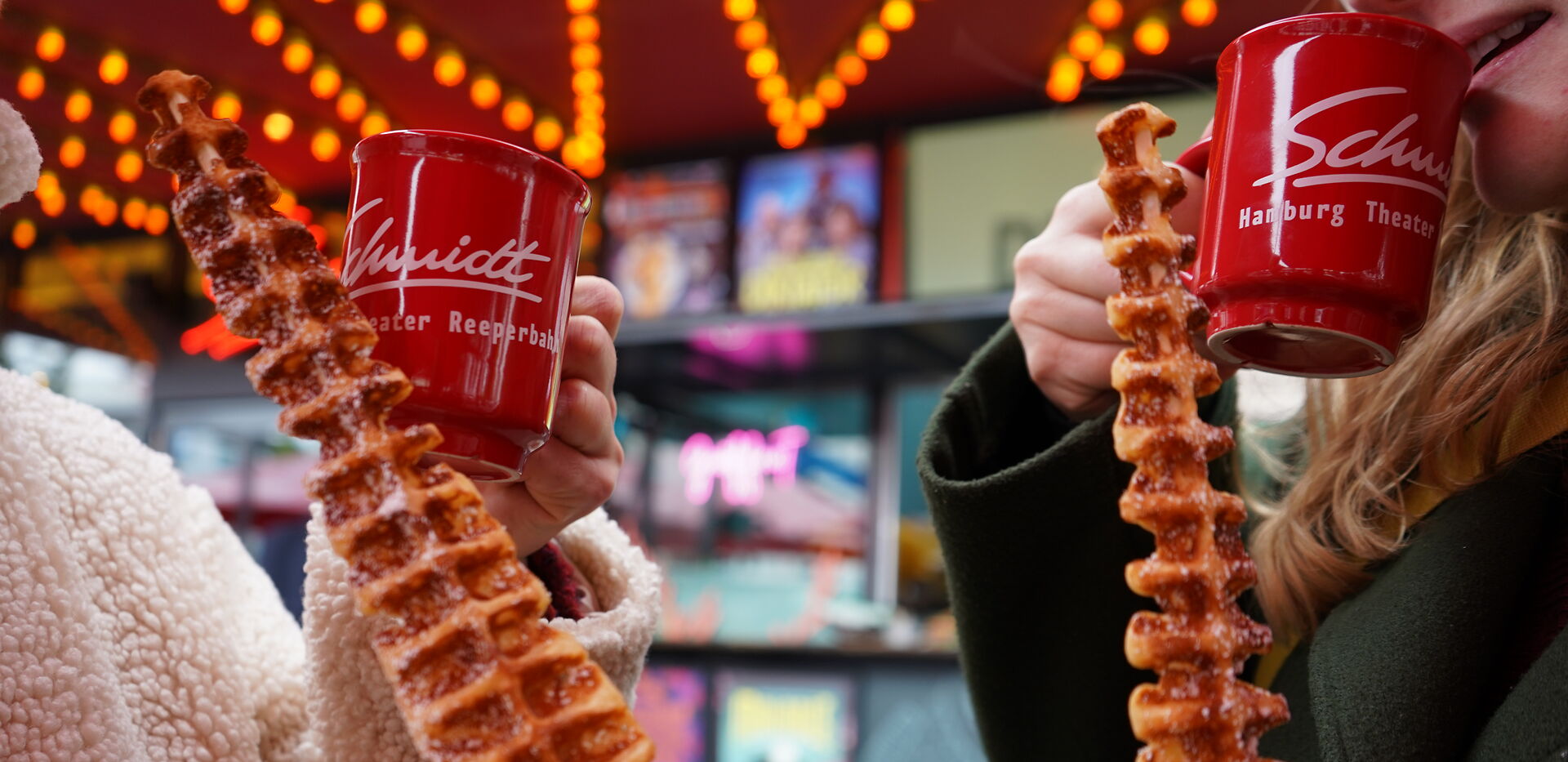 Wenn der Wind so richtig knackig über den Spielbudenplatz fegt, lockt süßer Waffelduft vors Schmidt. Das Deli serviert euch frische Waffeln am Stiel mit allerlei bunten Toppings und heiße Getränke, die Hände und Bauch gleichermaßen wieder auftauen. Unsere Fischbrötchen gibt's dann ab dem Frühjahr wieder.