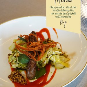 | Birnenterrine, warmer Bohnensalat, krosser Bauchspeck, Speckstippe dabei | 13.5 |
