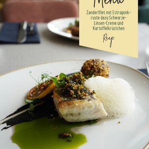 Okay, da läuft einem ja das Wasser im Mund zusammen: Zanderfilet mit Estragonkruste, dazu Schwarze-Linsen-Creme und ...